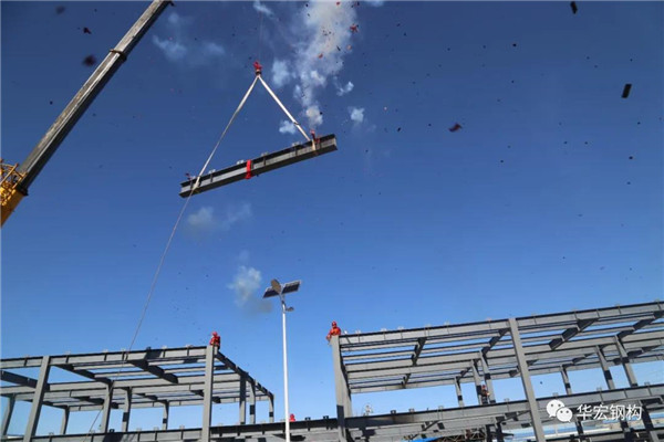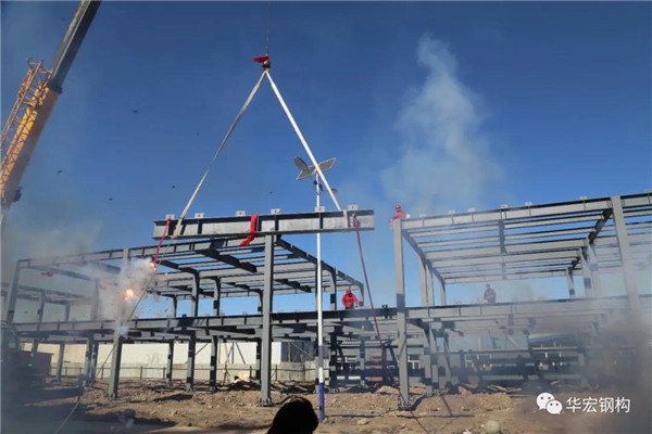 2021年4月3日,8點58分,萬里晴空,施工現(xiàn)場鞭炮齊鳴、掌聲雷動,在華宏人共同見證下,寒地裝配式鋼結(jié)構(gòu)建筑—員工公寓主梁吊裝成功,標(biāo)志著工程鋼結(jié)構(gòu)主體順利完成,這也是工程項目建設(shè)開工以來取得的階段性成果。